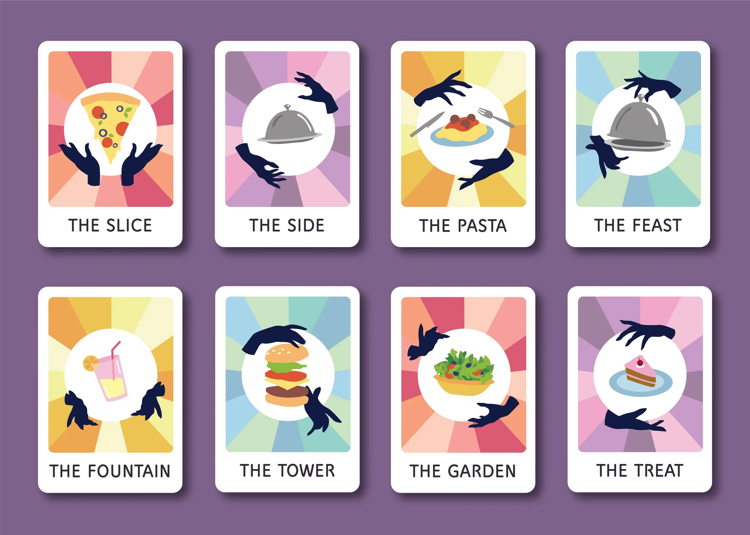 A Mystery Box feature within the app allows customers to avoid analysis paralysis (users becoming overwhelmed by too many menu options and choosing not to order anything at all), where an all-knowing psychic delivers a surprise meal, informed by user-set preferences and previous interactions with the app. This algorithm based menu, as well as the regular fixed menu mobile format, draw reference to tarot readings; each type of food is illustrated as a playful iteration of a Major Arcana card, and the size and quantity of menu items in an order are listed as single draw, three card spreads, five card spreads, or seven card spreads.