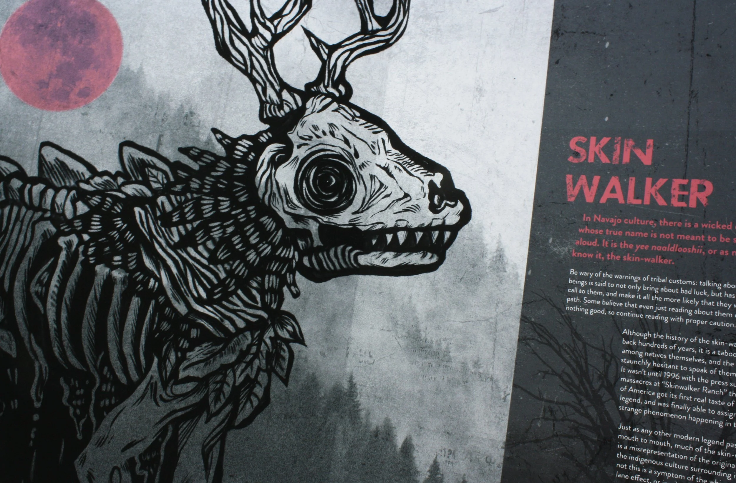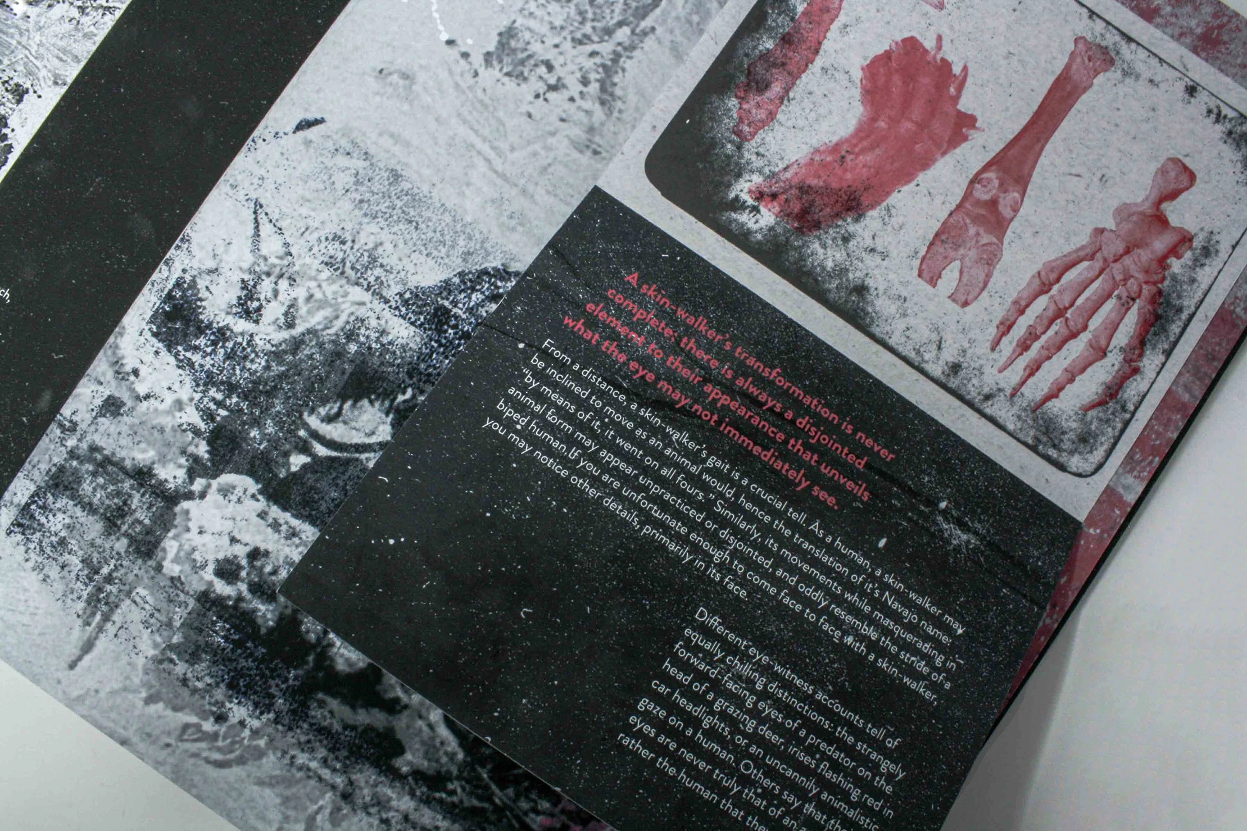 For this project, I was tasked with conceptualizing, designing, and building a book that functioned dually in augmented reality. I’ve always had an interest in all things occult, and I thought it might be exciting to explore some of those pseudo-scientific themes in a project with so much interactive potential. I narrowed my concept to an encyclopedia of urban legends, creating an illustrative “survival handbook” that could be referred to in an encounter with these supposed phenomena.